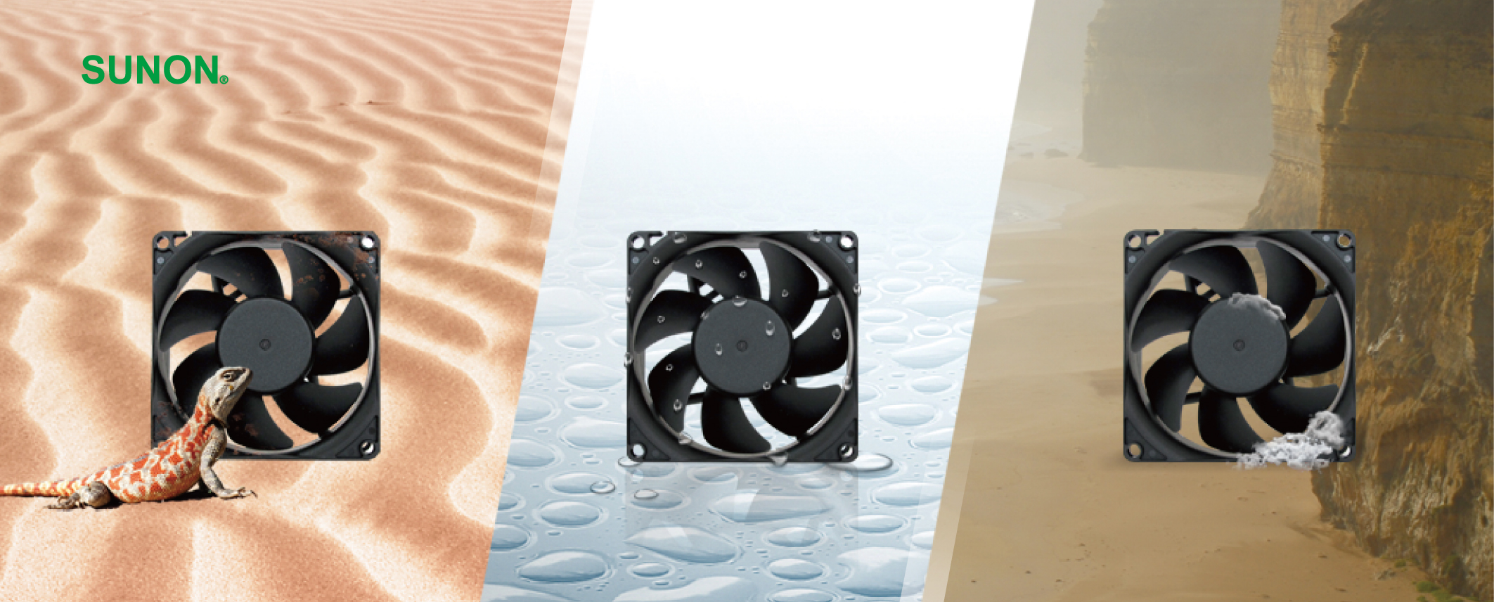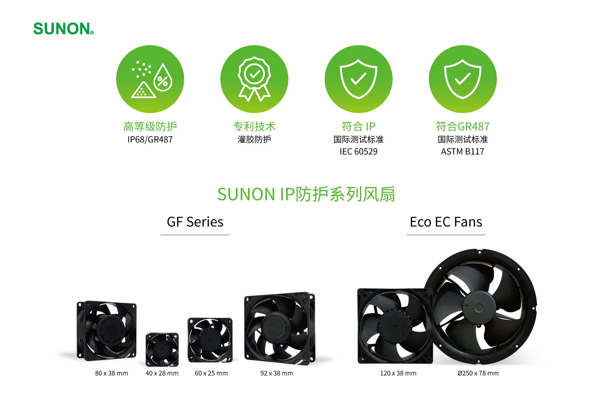 面臨越來越劇烈的全球環境變化,SUNON創新開發「最高防塵防水IP 68風扇&耐鹽霧GR487風扇」: GF系列目前已推出3個尺寸:40x40x28、60x60x25、92x92x38 mm,還有即將上市的80x80x38mm耐鹽霧系列,更多尺寸將陸續發行,以專利灌膠馬達防護技術(中國發明專利ZL 2013 1 0481929.6/2014 1 0022982.4)完整包覆整顆馬達,可有效防護馬達隔絕灰塵、水、鹽霧等物質,讓風扇不論在沙漠、極地、高山、海邊等惡劣環境下可長時間穩定運作,提供高效能的散熱,展現SUNON領先業界的產品競爭力。