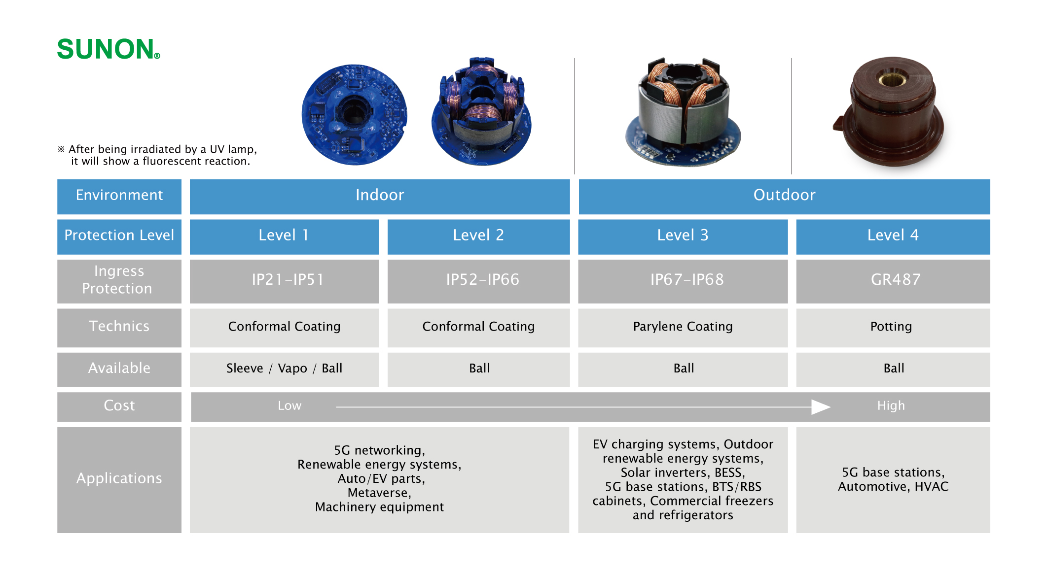 SUNON IP防護風扇依室內戶外應用環境的需求推出標準Level 1-4的保護等級設計服務,采用先進IP技術和高質量防護材料,為各式應用系統規劃優化IP風扇防護組合,且符合國際測試標準(防水防塵IEC60529 / 防鹽霧ASTM B117),嚴格把關高質量的產品防護設計,確保SUNON IP風扇系列具備最佳的防水防塵耐鹽霧性,除了能應用在戶外應用產業上,也能被應用在其他需要面對嚴苛環境挑戰下,和全天候不間斷的長時間運作需求的設備系統,目前已成功應用在多類的產業,提供高效散熱和長效使用壽命。